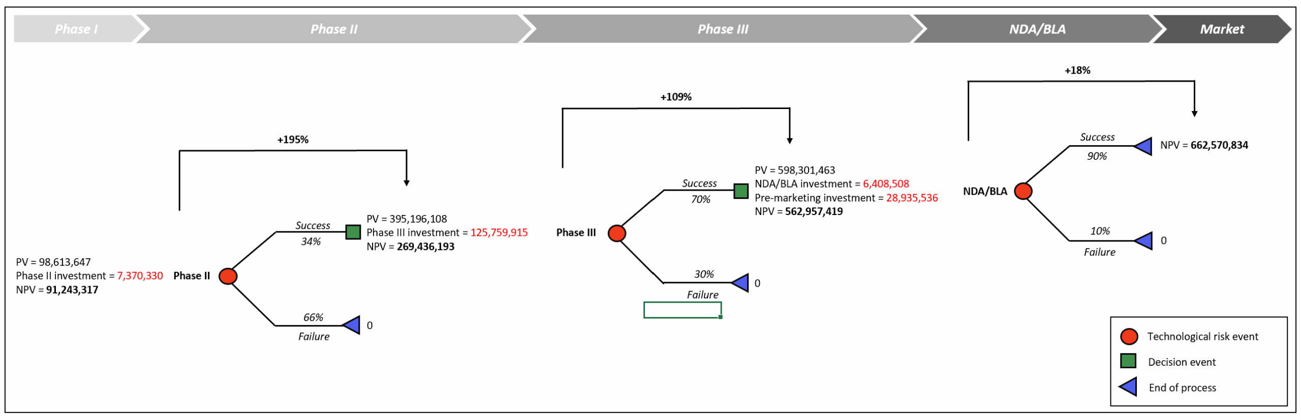 Given the high risk and uncertainty of biotech R&D, managerial flexibility is a crucial component of value. We use Decision Tree Analysis (DTA) to map out the strategic choices available throughout the development process. This approach helps us capture technological and diversifiable risks not priced by the market and reflects the real options managers have—such as whether to continue or halt a project at key milestones.